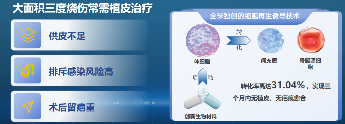 全球独创新技术,治疗大面积三度烧伤, 无植皮,无疤痕愈合。该技术突破传统治疗瓶颈 ,简化操作、降低成本、减轻痛苦 ,并显著提升军事应急公共安全和重大灾害救治能力 ,具有重大战略与社会价值。