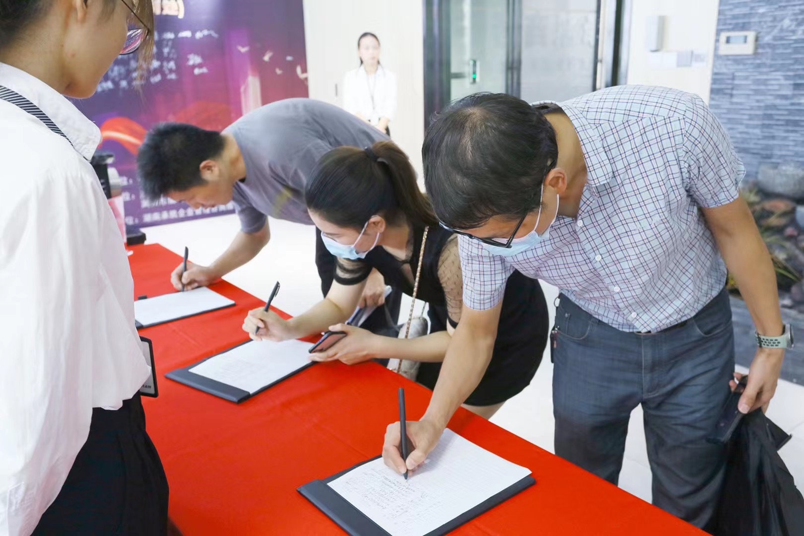 疫情期间,所有参会人员入场前需自觉排队接受工作人员体温检测,佩戴口罩,并填写好签到表。